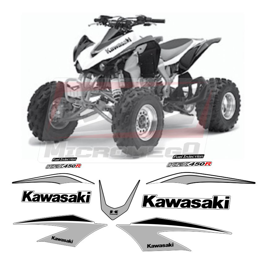 Kit de Calcas Sticker Calcomanías Kawasaki Kfx 450 2008 diseñadas para restauración, fabricadas con los detalles y dimensiones de las originales.