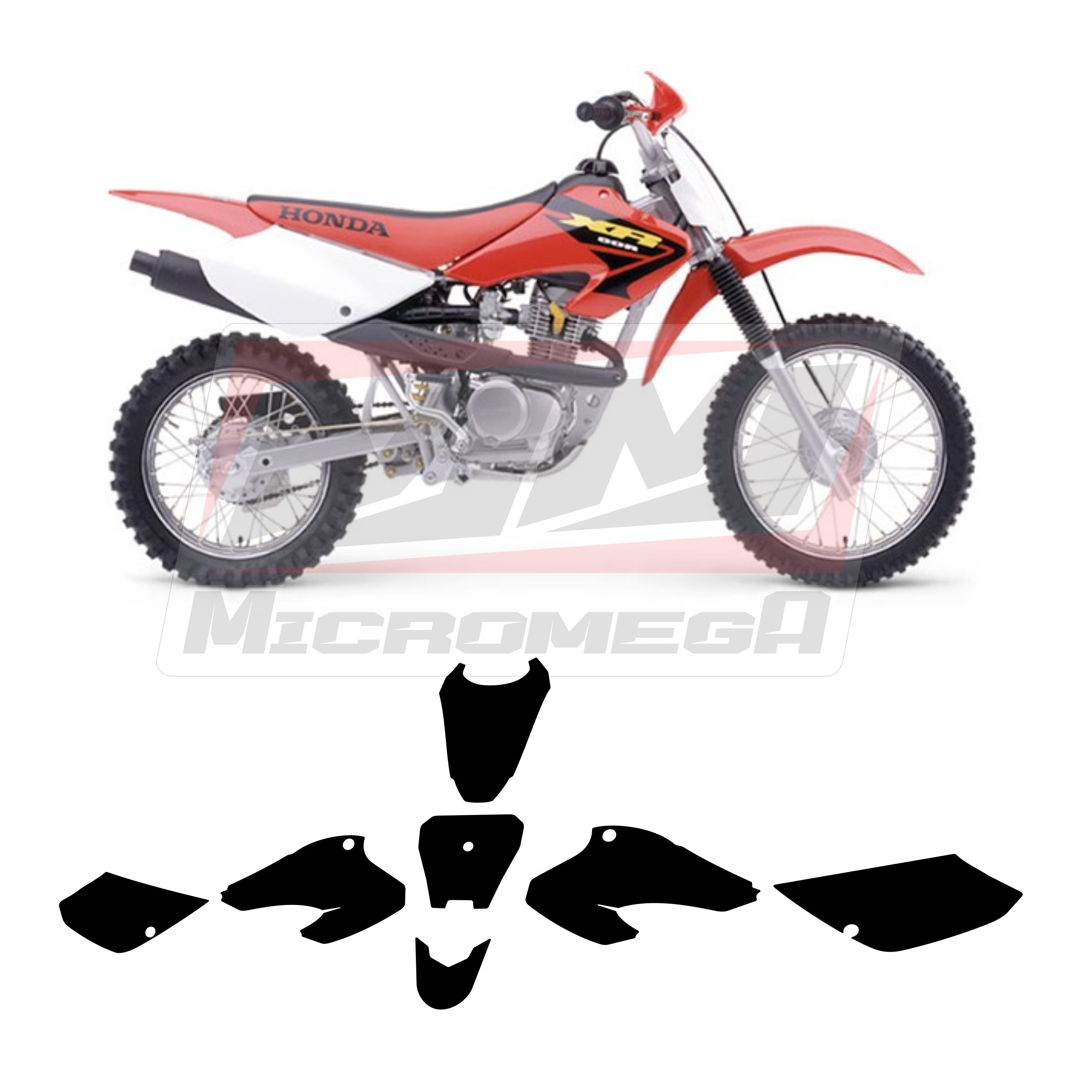 kit de Plantilla Vectorizada Honda Xr 80 100 01-03 a escala real, contiene las partes esenciales para diseñar tus gráficos personalizados muy fácil. Disponibles en formato .epc o .cdr